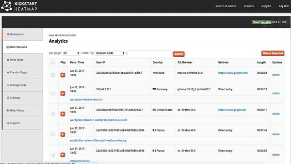 Mit Session Play wird die komplette Sitzung deiner Kunden als Video aufgezeichnet. Diese „Sessions“ kannst du im Nachhinein abspielen und auswerten. Schau dir 1:1 an, wie sich deine Besucher durch die Website bewegen, wo sie ins Stocken geraten und welche Stellen deines Verkaufskanals du optimieren muss.