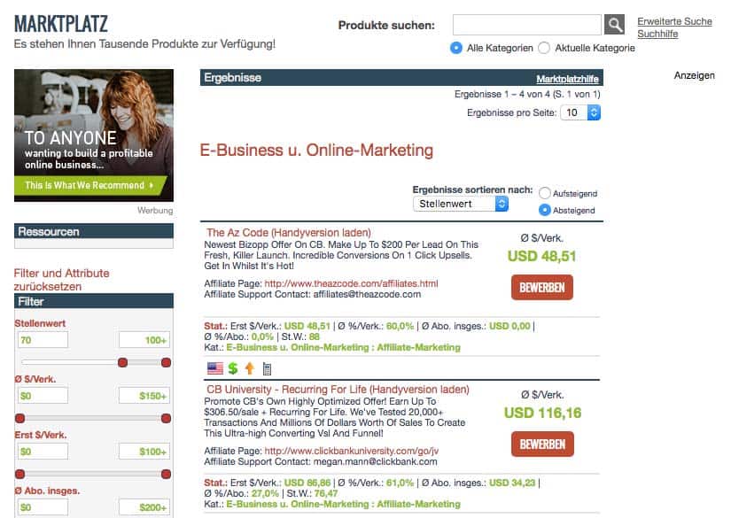 Mit dieser Methode finde ich die Top-Produkte heraus und kann erkennen, ob sie Gewinn bringen oder nicht. Gehe dazu zu Clickbank und schaue, was auf dem Marketplace (Marktplatz) verkauft wird.