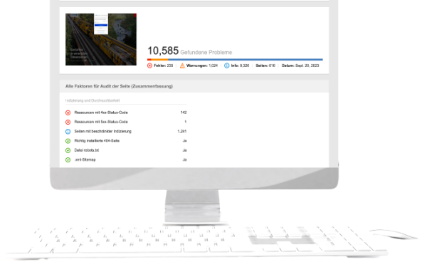 Die technische SEO-Analyse und On-Page-Optimierung erfordern eine solide Datenbewertung. Wir übernehmen die komplette Arbeit und liefern ein fertiges Handout mit allen Ergebnissen, Auflistung aller Problemstellen und den jeweiligen Lösungsoptionen.